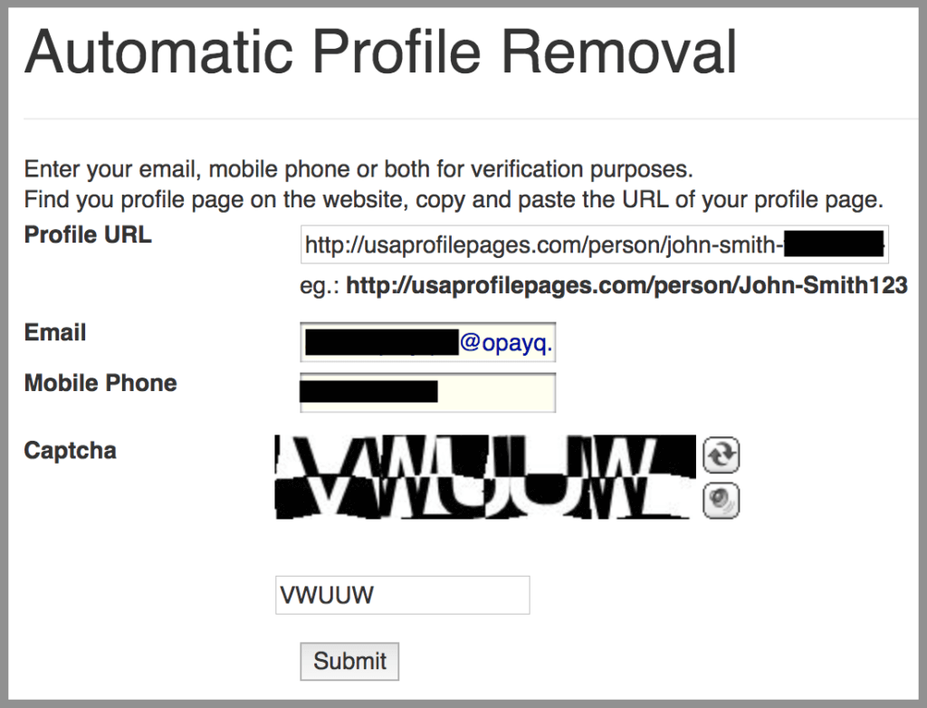 4. Go to http://usaprofilepages.com/Remove and paste the url. Fill in your contact information (we recommend using a masked email and phone number), perform the CAPTCHA, and click “Submit”.