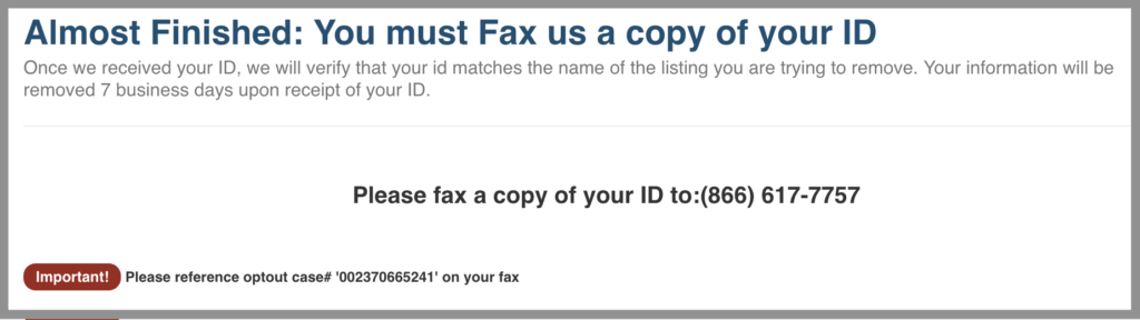 b. You may also fax a copy to (866) 617-7757. Again, be sure to block out your photo, signature, and ID number, and provide the reference number. Also, be sure to reference your opt-out case number.