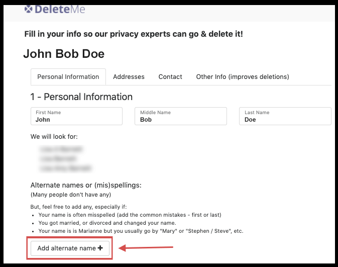 Note: DeleteMe will only remove the information of the individuals included in your DeleteMe subscription. If you add names that are not yourself or others included in your DeleteMe subscription, they will not be removed.