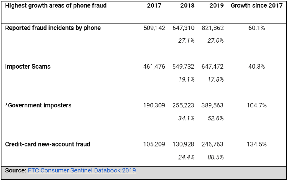 What makes imposter scams particularly effective, and particularly lucrative (a total of $667m in financial damages caused in 2019, according to FTC), is that many of the worst robocall scams rely on detailed information previously gathered online about targets in order to then exploit them.