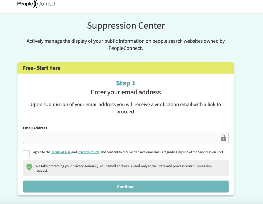 2. Enter your email address, check the agreement box and click “Continue”. You must use an email address that TruthFinder has listed under your profile on their website.