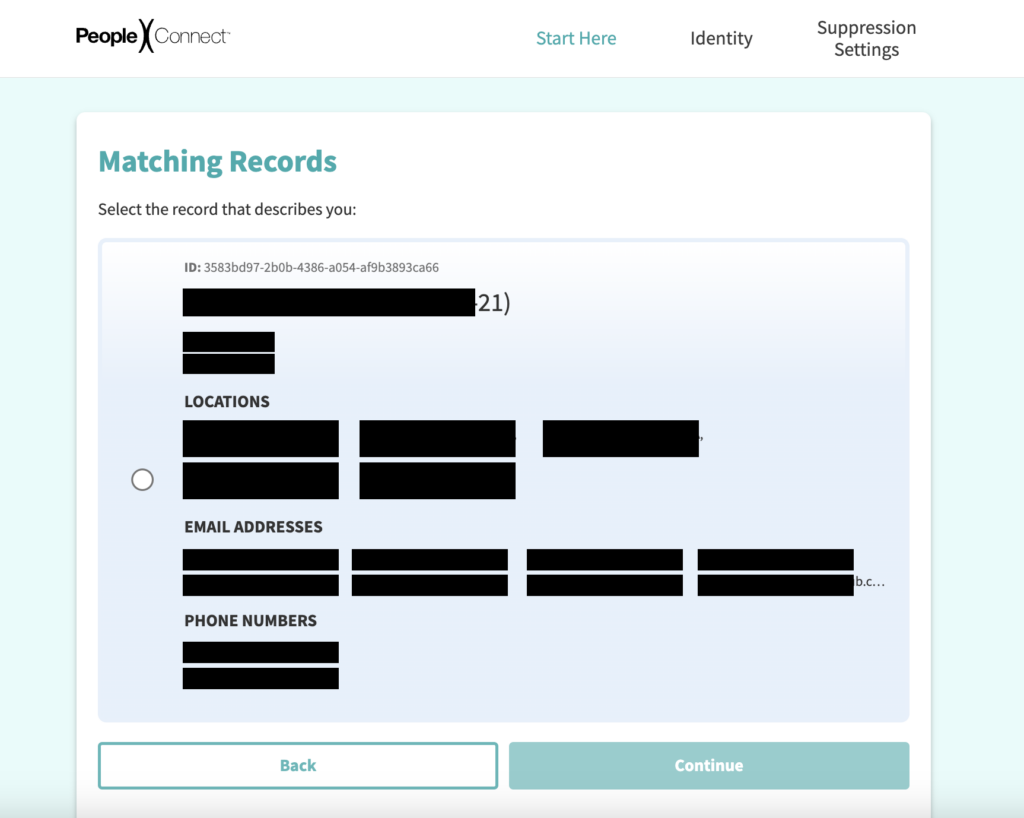 8. Select the record that matches your personal information, and click “Continue”